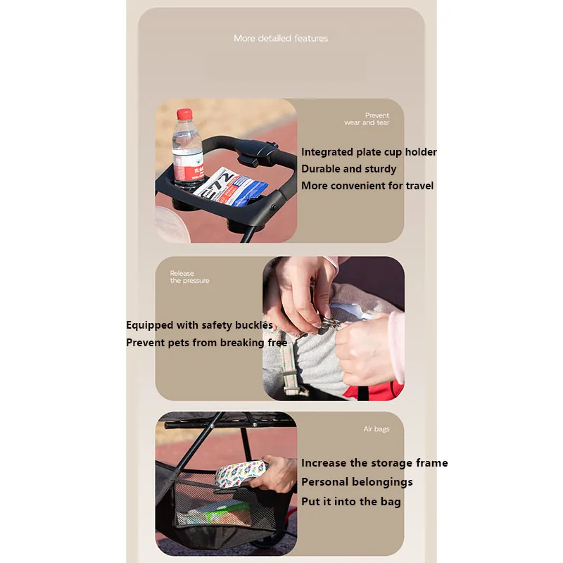 The stroller comes with a storage bag and cup holder, making it easier for you to carry pet food and pet water cups for travel. You can also put your pet toys and keys together in the storage bag, making it easy to take your pet outdoors.