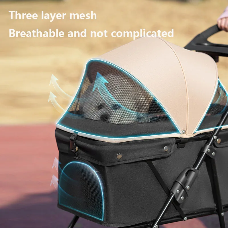 The mesh fabric is made of high-quality Oxford cloth, which can make the pet's skin feel comfortable while maintaining the breathability of the mesh fabric. It can keep the air inside the stroller flowing and not make the pet feel stuffy and hot.