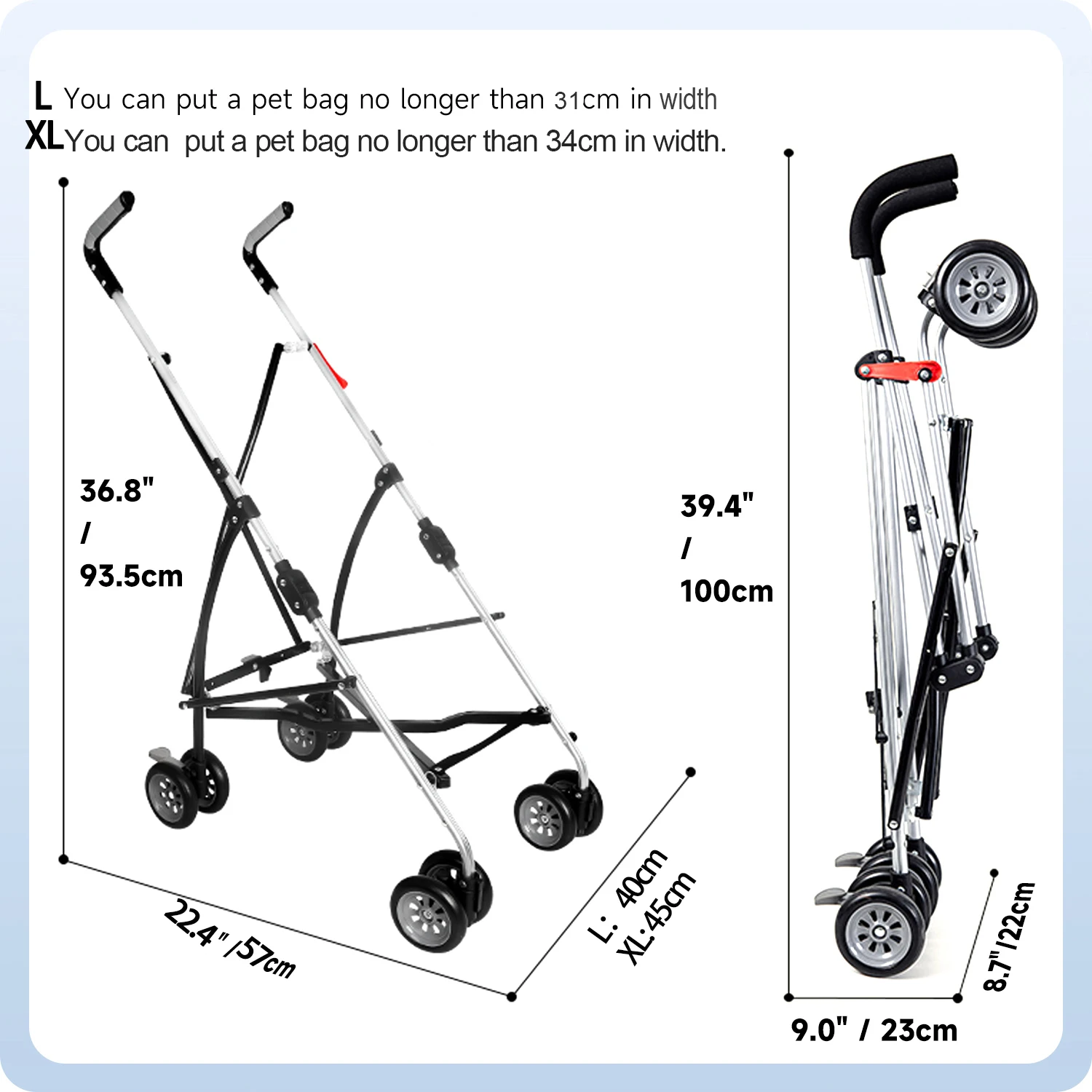 -XL Size :You can put pet bags with a width of no more than34CMon the stroller frame